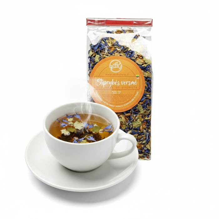 Žolelių arbata „Stiprybės versmė“ – natūralus žolelių mišinys su šaltalankių uogomis ir lapais, juodųjų serbentų lapais bei rugiagėlių žiedlapiais, skirtas kasdieniam vartojimui. Arbata išsiskiria ne tik skoniu, bet ir natūraliomis spalvomis, kurios džiugina dar prieš pirmą gurkšnį.